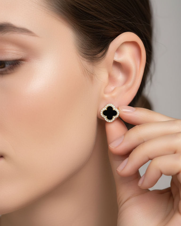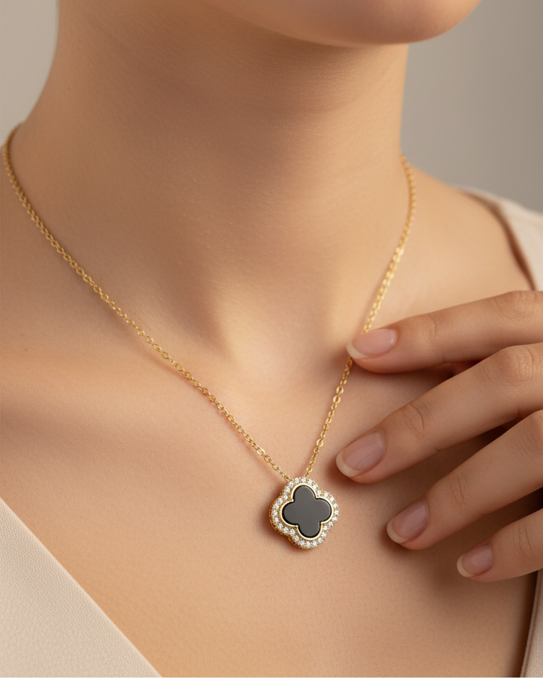 This sleek four-leaf pendant swings softly at your collarbone, catching light and drawing attention in all the right ways. The deep black enamel center, embraced by sparkling crystals, creates that perfect balance between bold and refined. Designed to feel as comfortable at coffee catch-ups as they do at evening celebrations.