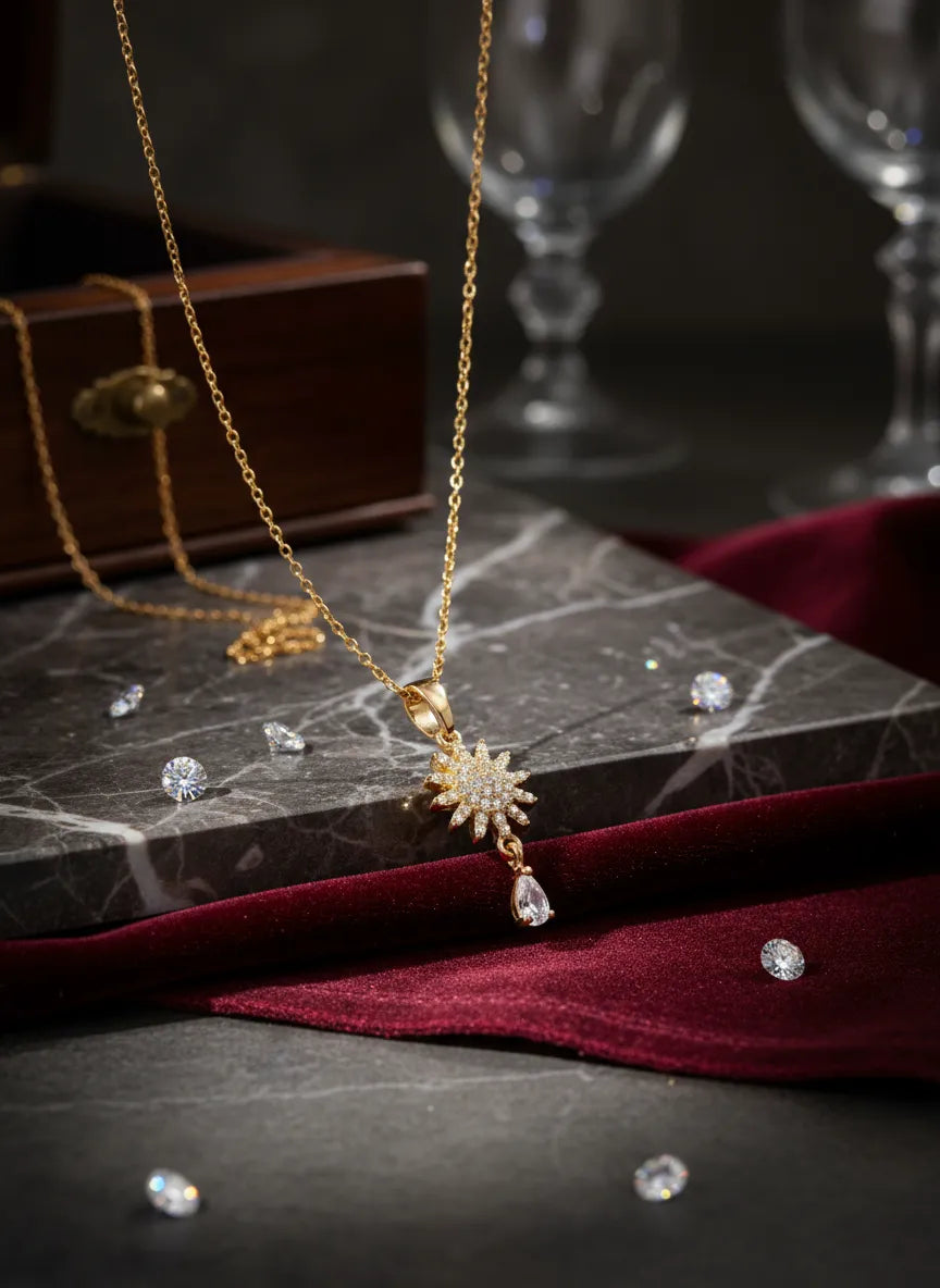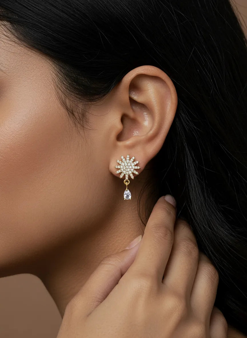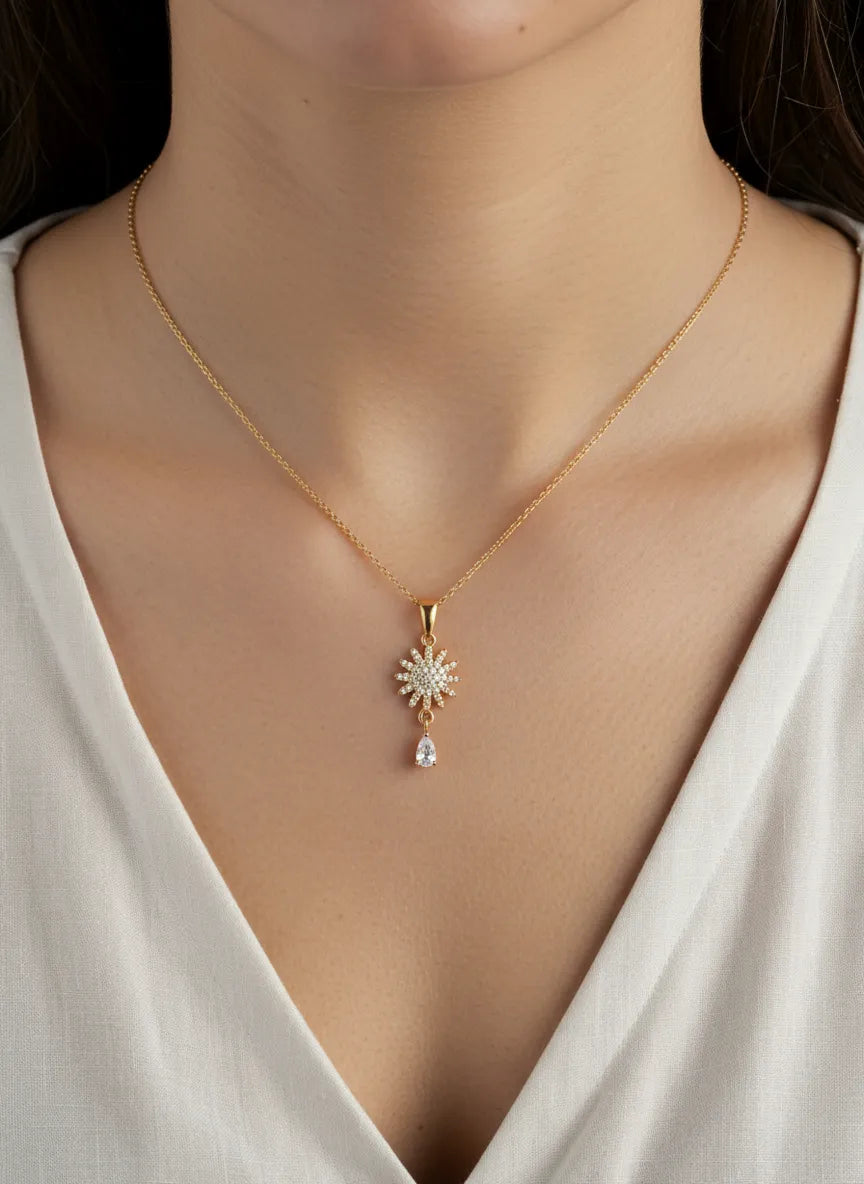 This beautifully crafted jewelry set features a radiant sunburst pendant paired with matching tops, each shimmering with fine stones that reflect light effortlessly.