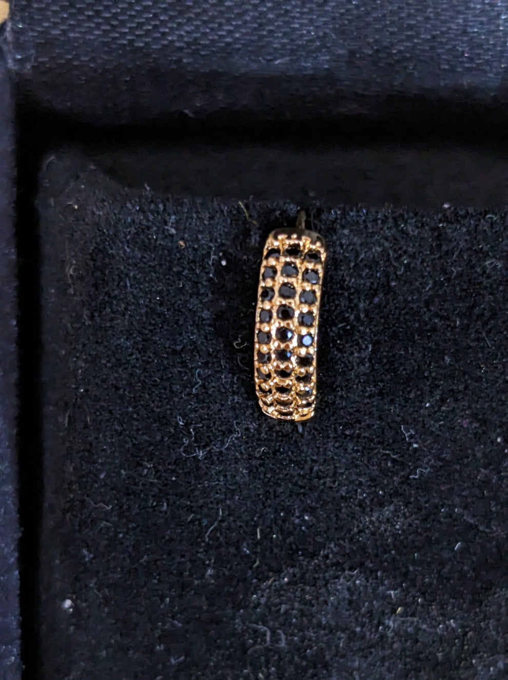 The Midnight Luxe Huggies bring a touch of modern drama to your everyday jewelry rotation. Sleek gold hoops are adorned with three rows of jet-black crystals that catch light with mysterious brilliance—creating a look that's equal parts rock-and-roll and red-carpet ready.